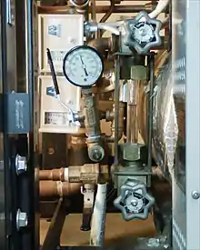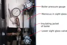 The sight glass is connected to the boiler through a valve at upper and lower ends. The glass is sealed into the valve by compression of a rubber gasket in the annular space between the glass and the valve body. Compression is by action of a large nut pressing against a compression ring bearing on the end of the gasket.