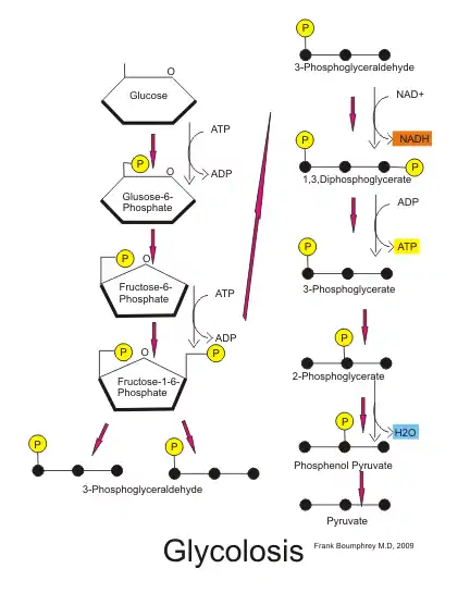 Glucose is broken down in a two step process. First, it is broken down into two molecules of pyruvate by a process called glycolosis. This occurs in the cytoplasm of the cell. Then, if oxygen is present, the pyruvate is taken into the mitochondria, and is broken down into Acetyl-CoA (Acetyl coenzyme A), which enters the citric acid cycle, producing high energy hydrogen bonds. The mitochondria process these bonds into high energy ATP (Adenosine tri-phosphate) from ADP (Adenosine di-phosphate). This ATP powers the reactions of the cell. Some 36-38 molecules of ATP are produced for each glucose molecule so processed. This process is shown graphically in the following flow chart.