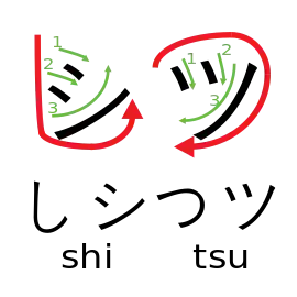 シ and ン can be thought of as smiley faces looking towards the right. The character with both eyes is a shi (she), while the character with one eye has a nice eyepatch. The short strokes on the top slant towards the right, while the same strokes for ツ and ソ slant downwards.