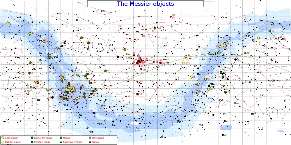 | M45 | Pleiades | File:Pleiades Lanoue.png | Open cluster | 0.4 | Taurus | 1.4 | |