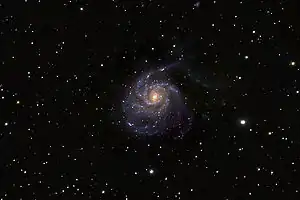 The Pinwheel Galaxy (also known as Messier 101 or NGC 5457) is a face-on w:spiral galaxy about 27 million w:light-years away in the w:constellation w:Ursa Major.