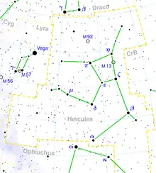It is located at w:right ascension 16h 41.7m and w:declination +36° 28'. With an w:apparent magnitude of 5.8, it is barely visible with the w:naked eye on a very clear night. Its diameter is about 23 arc minutes and it is readily viewable in small telescopes. Nearby is w:NGC 6207, a 12th magnitude edge-on galaxy that lies 28 arc minutes directly north east. A small galaxy, IC 4617, lies halfway between NGC 6207 and M13, north-northeast of the large globular's center.