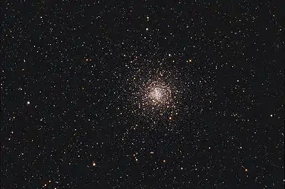 Messier 4 or M4 (also designated NGC 6121) is a globular cluster in the constellation of Scorpius. It was discovered by Philippe Loys de Chéseaux in 1746 and catalogued by Charles Messier in 1764. It was the first globular cluster in which individual stars were resolved.