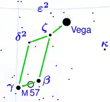 M57 is located in w:Lyra, south of its brightest star w:Vega. w:Vega is the northeastern vertex of the three stars of the w:Summer Triangle. M57 lies about 40% of the angular distance from β Lyrae to γ Lyrae.[5]