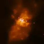 Recently, M82 has undergone at least one tidal encounter with M81 resulting in a large amount of gas being funneled into the galaxy's core over the last 200 Myr.[3] The most recent such encounter is thought to have happened around 2–5×108 years ago and resulted in a concentrated starburst together with a corresponding marked peak in the cluster age distribution.[3] This starburst ran for up to ~50 Myr at a rate of ~10 M⊙ per year.[3] Two subsequent startbursts followed, the last (~4–6 Myr ago) of which may have formed the core clusters, both super star clusters (SSCs) and their lighter counterparts.[3]