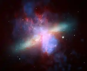 ![]() A combined Hubble/Spitzer/Chandra image of M 82. Credit: w:NASA/w:JPL-Caltech/STScI/CXC/UofA/w:ESA/AURA/JHU. | |
