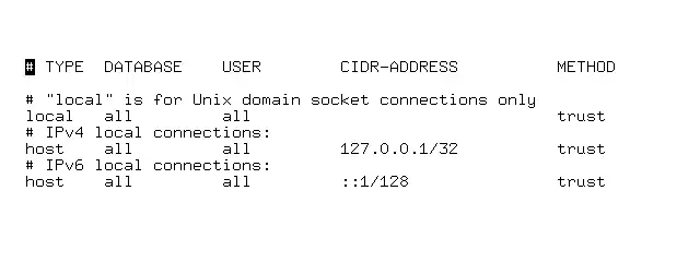 Note: Using the Framework with postgres requires edits to /etc/postgresql/x.x/main/pg_hba.conf. Replace the default "ident" method with "trust" as shown:
