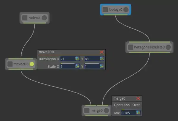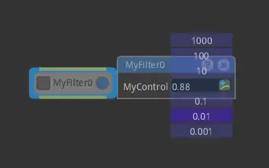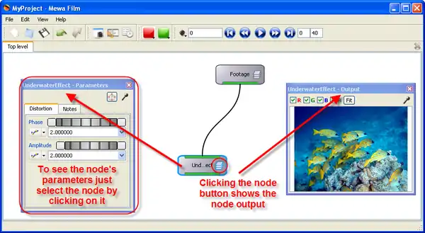 To bring up the parameters window just click on the node parameters button. A parameters window pops up showing the node's parameters. Some nodes, like move2D node, have parameters that will be shown on the output window.
