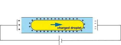 A voltage can be applied on a droplet, if the surface is an electrode and an other electrode is in contact with the liquid droplet. A voltage difference changes the surface energy by: