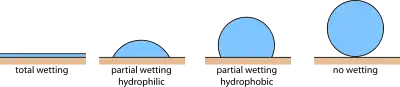 The liquid droplet pearls, and assumes a perfectly spherical shape. It occurs on surfaces such that then , the solid does not like to be covered.
