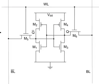 A single bit of storage in SRAM, showing 6 transistors.