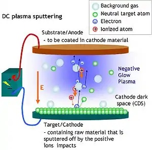 Energetic ions sputter material off the target which diffuse through the plasma towards the substrate where it is deposited. There is no strong plasma glow around the cathode since it takes a certain distance for the plasma to be generated by electron avalanches started by a few secondary electrons from the sputtering process.