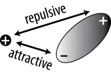 Depending on the angle the interactions can be repulsive when the charge is close to the like side of the dipole (i.e, + +) attractive if the charge is close to the opposite charged end of the dipole (i.e., + -) and zero if the positive and negative ends of the dipole are equal distances from the charge (e.g., perpendicular).