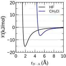 Magnitudes of hydrogen bonds are dependent on a couple different factors, the first is the difference in electronegativity of the atom that hydrogen is attached. The larger the difference in electronegativity the stronger the interaction will be. The second being the radius of the acceptor, it needs to be of a size that will allow for the hydrogen to get close enough to interact. Generally the Slater radius should be between 0.65 – 1.00 Å, any larger than this will not allow for the hydrogen to become close enough to the atom to attractively interact. The figure on the right illustrates the potential energies of the dimerization of HF and CH3Cl, They both have very similar dipole moments, and but due to the hydrogen bonding the interactions between the HF molecules a larger potential energy minimum can be obtained, illustrated by the larger well depth. Also in this figure the well appears at a lower radius for the HF, and this is due to the previously mentioned dependence on the radius of the acceptor, the F is smaller than the Cl allowing for the hydrogen to get closer for stronger interactions. The directionality of the hydrogen bond also has effects on the strength of the bond, the optimal angle of interaction is 180°, while the optimal distance for interaction is between 1.5 – 2.5 Å. Planar molecules can contain very strong hydrogen bonding capabilities. The molecule being flat allows for constructive bond dipoles and it avoids steric clashes between other atoms in the molecule.