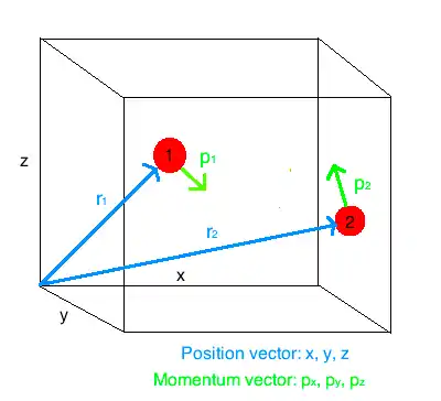 Consider a system containing two particles of Argon (labelled 1 and 2, respectively), where N = 2. Since phase space is described by 6 N dimensions the total number of spatial variables becomes 6(2) = 12.