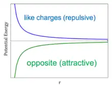For electrostatic interactions following this general form, the potential energy for the interaction between oppositely-charged particles will approach negative infinity as the distance between approaches zero. This would suggest that if electrostatic interactions are the only forces in our model, oppositely-charged ions would collapse onto each other as approaches zero. Clearly this is an inaccurate representation of close range interactions, and some repulsive term must also be considered.