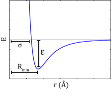 where ε is the potential well depth, σ is the distance where the potential equals zero (also double the van der Waals radius of the atom), and Rmin is the distance where the potential reaches a minimum, i.e. the equilibrium position of the two particles.