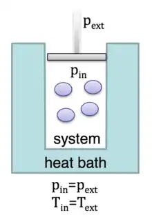 In the isothermal-isobaric ensemble, energy can transfer across the boundary, but matter cannot. The volume of the system can change such that the internal pressure of the system matches the pressure exerted on the system by its surroundings. Similar to the canonical ensemble, we can describe the isothermal-isobaric ensemble as a system immersed in a heat bath at a temperature (T), where the heat bath is much larger than the system. No amount of heat put off by the system will significantly increase the temperature of the surroundings.