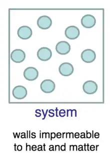 In the canonical ensemble, the volume of the system is fixed, and energy can transfer across the boundary between system and surroundings, but matter cannot. We can describe systems as being immersed in a heat bath at a temperature (T), where the heat bath is much larger than the system. No amount of heat put off by the system will significantly increase the temperature of the surroundings. The canonical ensemble applies to systems of any size; while it is necessary to assume that the relative size of the heat bath is very large, the system itself may be small or large. Now because the system and surroundings are in thermal contact, the system will transfer heat (q) to and from the surroundings until they are in thermal equilibrium. Therefore, unlike the microcanonical ensemble, the temperature of the canonical ensemble can be a defined constant (T). This ensemble is typically abbreviated in terms of constant number of particles, total volume, and temperature (NVT).