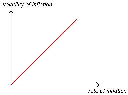 Empirical evidence suggests that there exists a relation between the rate of inflation and the volatility of inflation: The higher the average rate of inflation, the higher is its volatility. Example: If a country A has an average rate of inflation of approximately 3%, it might happen that the rate of inflation sometimes tends to be 1% or even 0% and sometimes a bit higher, like 5%. However it is very unlikely that country A will ever have inflation rates of 10% or 20%. In contrast to country A, country B has an average rate of inflation of 30%. When inflation has reached such a high level, it is inconceivable that inflation always fluctuates around 30% with rates of for example 28% or 33%. Instead the variance is much higher, country B could probably have inflation rates of 5% or 60%.