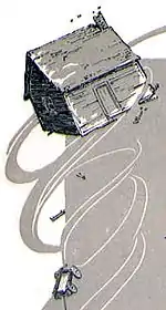Toto saltad ek Dorothyn brases e kashad se sub li lite, e li puera komensad riprenda lo. Tanta Em, tre pavorosi, jetad aperti li trape in li planche e klimad subu per li skale en li mikri, deslumosi true. Dorothy kaptad Toto finalim e komensad seku sen tanta. Kand la esed mi-trans li chambre venid grandi kriacho fro li vente, e li hause tremblad talim multim ke la perdad sen stea-povo e sideskad subitim a sur li planche.