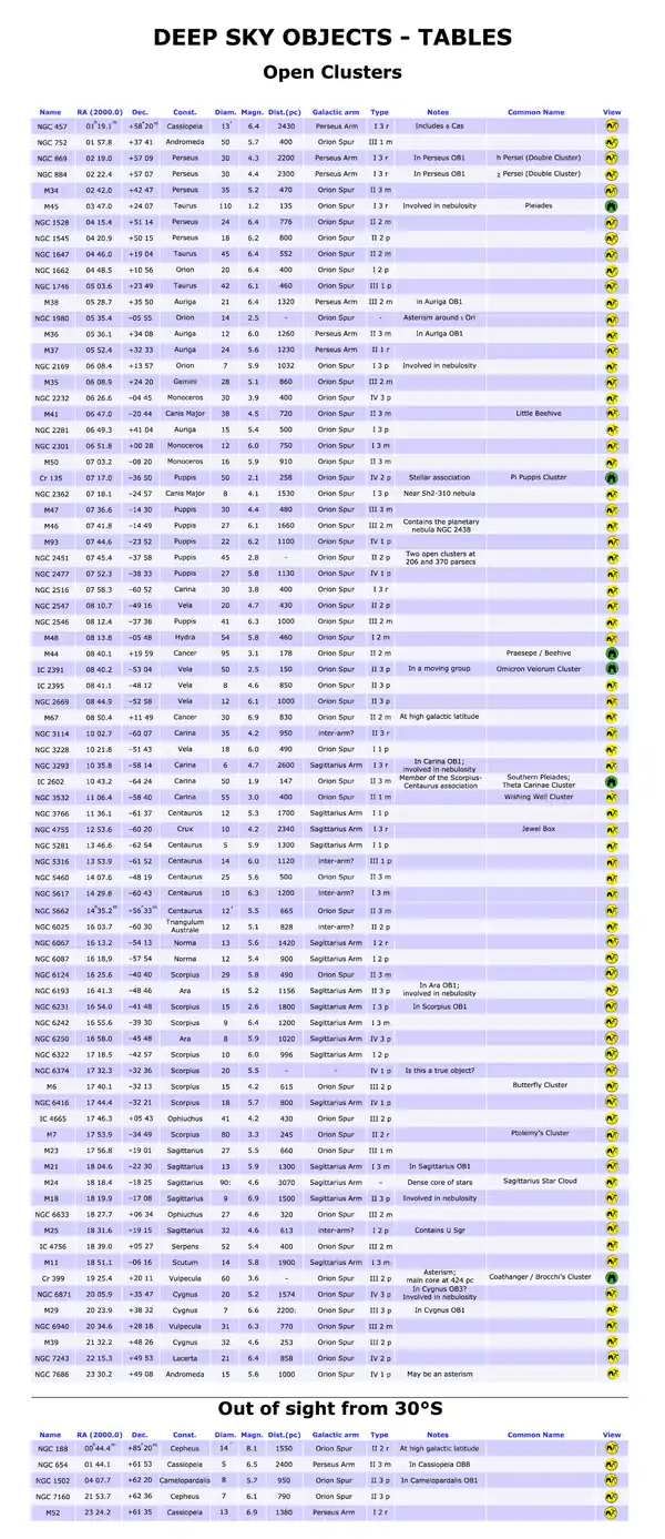 - Notes: notable notes about the cluster, membership in OB associations, nebulosity.