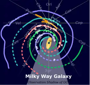 The Milky Way Galaxy is the galaxy in which the Solar System is located. All the stars that the eye can distinguish in the night sky are part of the Milky Way Galaxy, but aside from these relatively nearby stars, the galaxy appears as a hazy band of white light arching around the entire celestial sphere. The light originates from stars and other material that lie within the galactic plane. Dark regions within the band, such as the Great Rift and the Coalsack, correspond to areas where light from distant stars is blocked by dark nebulae.