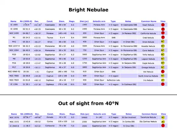 - Notes: notable notes about the nebula, membership in OB associations.
