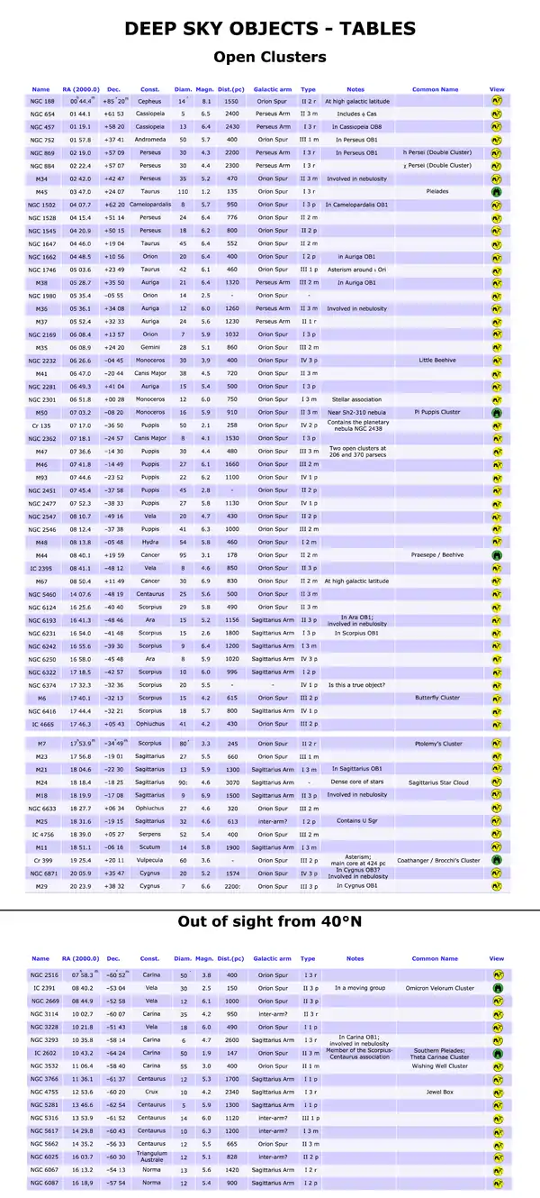 - Notes: notable notes about the cluster, membership in OB associations, nebulosity.