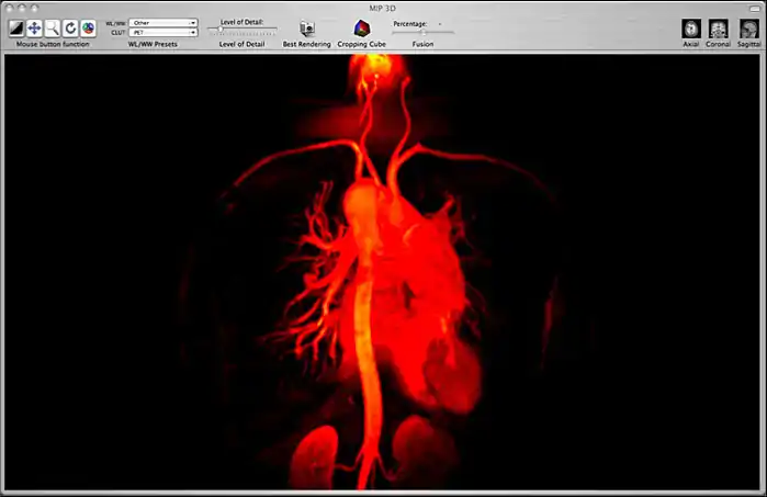 This reconstruction uses a ‘ray-tracing’ technique to identify which pixel has the maximum intensity on each ray. This technique is useful for contrast MRIs or CTs, and bone CTs.