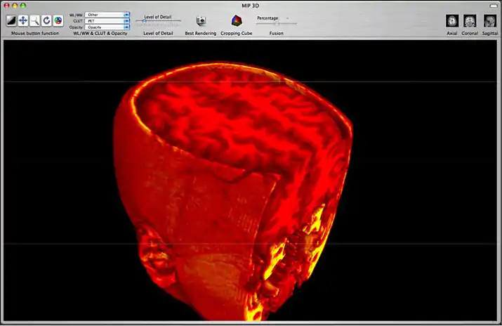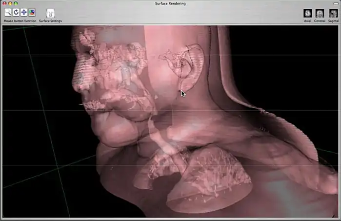 This reconstruction uses a ‘ray-tracing’ technique to apply a transparency/opacity to each pixel depending on their position and their intensity. This technique produces nice images of soft tissues for MRI and CT. It is actually the most used 3D technique and will produce the nicest images in many situations.