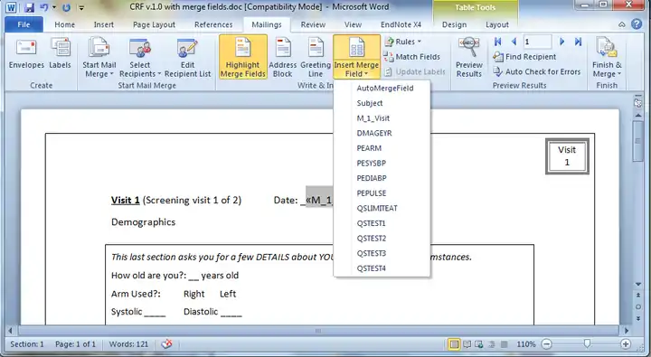 Insert merge fields throughout the CRF