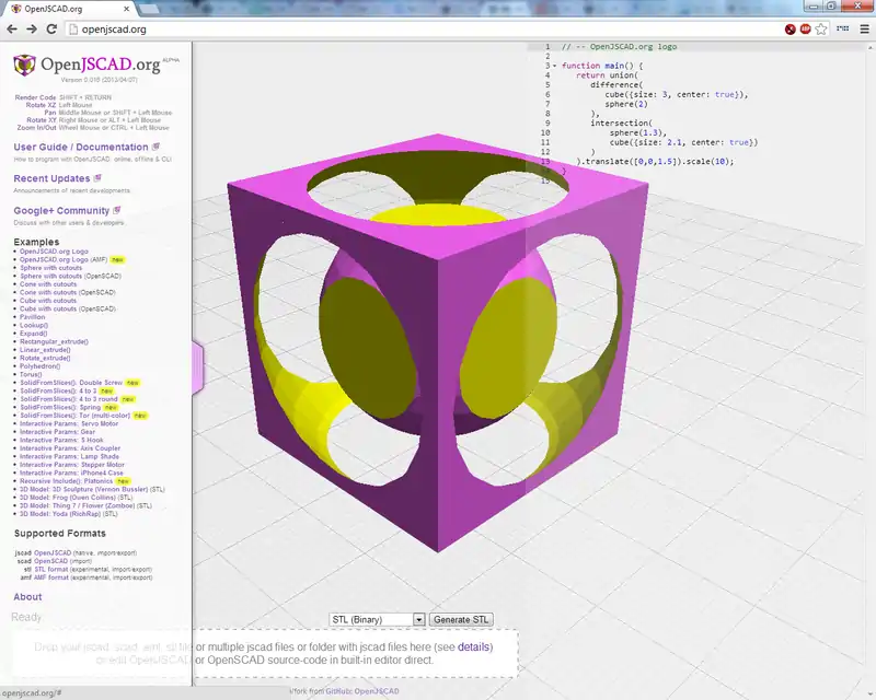 - web-online remote (e.g. http://openjscad.org/): given you drag & dropped the files, or they are available on the web-server (e.g. the examples)