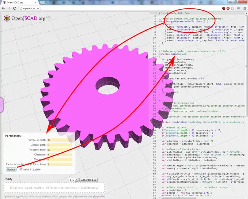 OpenJSCAD.org presents a page which shows a 3D viewer, as well as an editor: