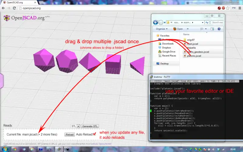 * Online (http://...): drag & drop entire folder, e.g. ProjectName/ to the drag & drop zone * Offline (file://...): drag & drop all jscad files (but not folder) to the drag & drop zone