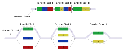 OpenMP programs work according to a so-called fork–join model, illustrated on the right. The OpenMP runtime maintains a thread pool, and every time a parallel section is encountered, it distributes work over the threads in the pool. When all threads are done, sequential execution is resumed.