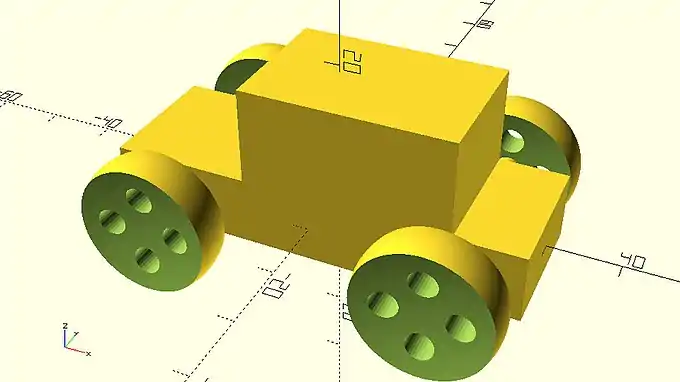 So far when you wanted to create an additional object in your model, you just added another statement in your script. The final car model is the union of all objects that have been defined in your script. You have been implicitly using the union command which is one of the available boolean operations. When using the union boolean operation, OpenSCAD takes the union of all objects as the resulting model. In the following script the union is used implicitly.