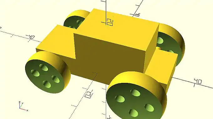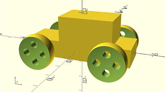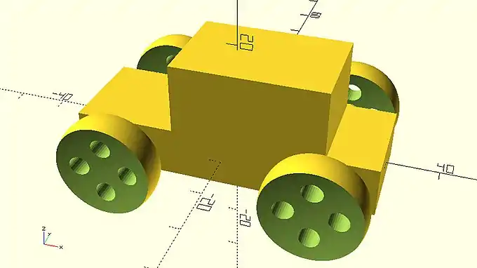 | Try defining a body and an axle module. What parameters should the body and axle modules have? Try recreating the car using the body, wheel and axle modules. Give the parameters of the wheel module a default set of values that corresponds to the front wheels. Pass different values to the wheel module when creating the rear wheels by defining appropriate variables in your script. Set default values for the parameters of the body and axle modules too. |