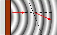Refraction is the change in direction and phase velocity of a wave due to a change in the medium in which the wave is traveling. A wave which undergoes this phenomenon is said to have been refracted. This phenomenon is most commonly observed when a wave passes from one medium to another at any angle other than 90° or 0°. Refraction is described by Snell's law (also known as the Snell–Descartes law and the law of refraction), which states that for a given pair of media and a wave with a single frequency, the ratio of the sines of the angle of incidence θ1 and angle of refraction θ2 is equivalent to the ratio of phase velocities (v1 / v2) in the two media, or equivalently, to the opposite ratio of the indices of refraction (n2 / n1):