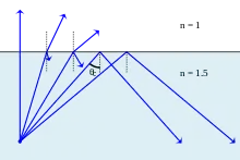 As the angle of incidence increases, the angle of refraction also increases. There comes a point in which the angle of refraction is 90° and means that the wave refracts parallel to the interface. This angle is called the critical angle and for angles greater than or equal to the critical angle, refraction does not take place and all of the light is reflected; this phenomenon is called total internal reflection and will be covered in the next section.
