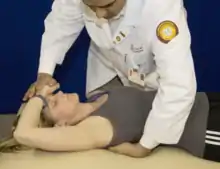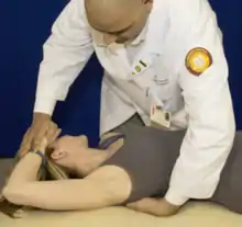 | Exhalation dysfunction key rib 2 (posterior scalene) | Patient is supine. Ask patient to place the dorsum of their dysfunction-side hand on their forehead, and then rotate their head away from the side of the key rib. Contact the key rib as close to the costotransverse junction as possible with one hand, and stabilize the patient’s head/hand with the other hand. Ask the patient to perform a forced maximal inhalation and simultaneously try to lift their head off the table. Resist their head motion, and during the inhalation phase apply a caudad force on the key rib at the costotransverse junction. | ![]() Rib 2 exhalation dysfunction |