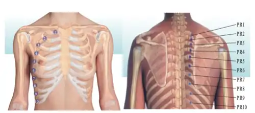 | PR2-PR10 | Superior surface of respective rib angles | Seated, F SARA |