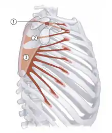 | Pectoralis minor | Ribs 3-9 | Coracoid process | Scapular retraction; respiration | Medial and lateral pectoral nerves (C6-T1) | ![]() 2 - Pectoralis minor |
