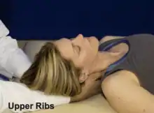 | Exhalation dysfunction key ribs 9-10 (latissimus dorsi) | Patient is supine. Ask the patient to place their dysfunction-side arm in abduction to 90 degrees. The elbow may be flexed to allow for better positioning. Contact the key rib as close the costotransverse junction as possible with one hand, and stabilize the patient’s elbow with the other hand. Ask the patient to perform a forced maximal inhalation and simultaneously try to adduct their elbow. Resist their elbow motion, and during the inhalation phase apply a caudad force on the key rib at the costotransverse junction. | ![]() Ribs 9-10 exhalation dysfunction |