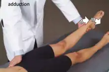 | Adduction | With the leg straight, it is taken to its adduction barrier | ![]() Spencer's technique of the hip - adduction |