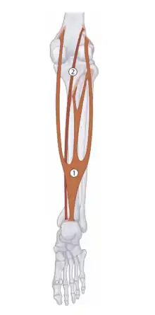 | Tibialis anterior | Upper 2/3 of the lateral surface of the tibia, crural interosseous membrane, and superficial crural fascia | Medial and plantar surface of medial cuneiform; medial base of first metatarsal |