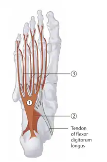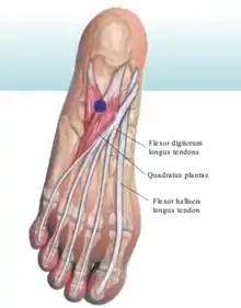 | Quadratus plantae | Medial and plantar borders on the plantar side of the calcaneal tuberosity | Lateral border of the flexor digitorum longus tendon | Redirects and augments the pull of flexor digitorum longus | Lateral plantar nerve (S1-S3) | ![]() 2 - Quadratus plantae |
