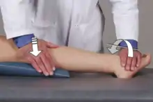A. The patient lies lateral recumbent with a pillow placed under medial aspect of the distal tibia to create a fulcrum; an inversion force is applied to the foot/ankle with slight internal rotation