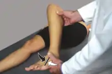 | The anterior drawer test and posterior drawer test are used to assess the ACL and PCL, respectively. To perform these tests, the patient is supine with the hips flexed to 45o, the knees flexed to 90o, and the feet flat on the table. The physician sits on the table in front of the knee being tested and grasps the tibia just below the line of the knee. The thumbs are placed along either side of the patellar tendon. The tibia is then drawn anteriorly. The test is positive if there is excessive anterior displacement of the tibia. Likewise, the posterior drawer test is done by applying a posterior force to the tibia. The test is positive if there is excessive posterior displacement of the tibia. |