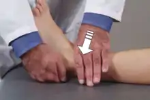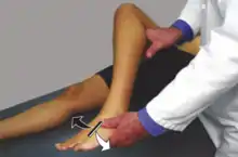 C. The knee is flexed and the dorsum of the foot is placed on the physician's thigh while the physician applies a compressive force on the calcaneus to produce marked flexion